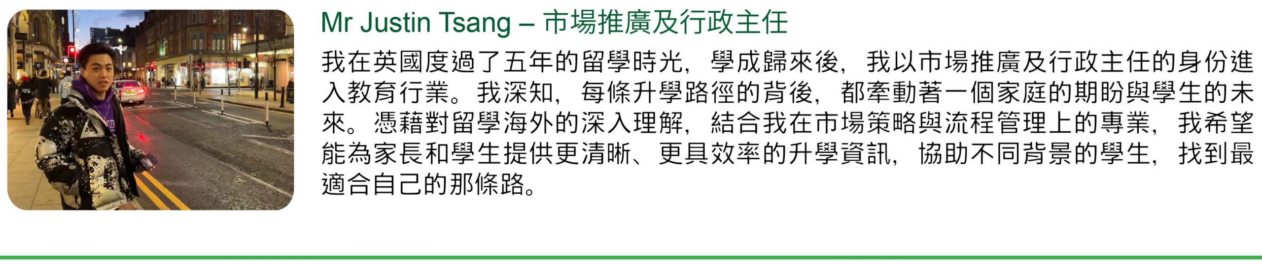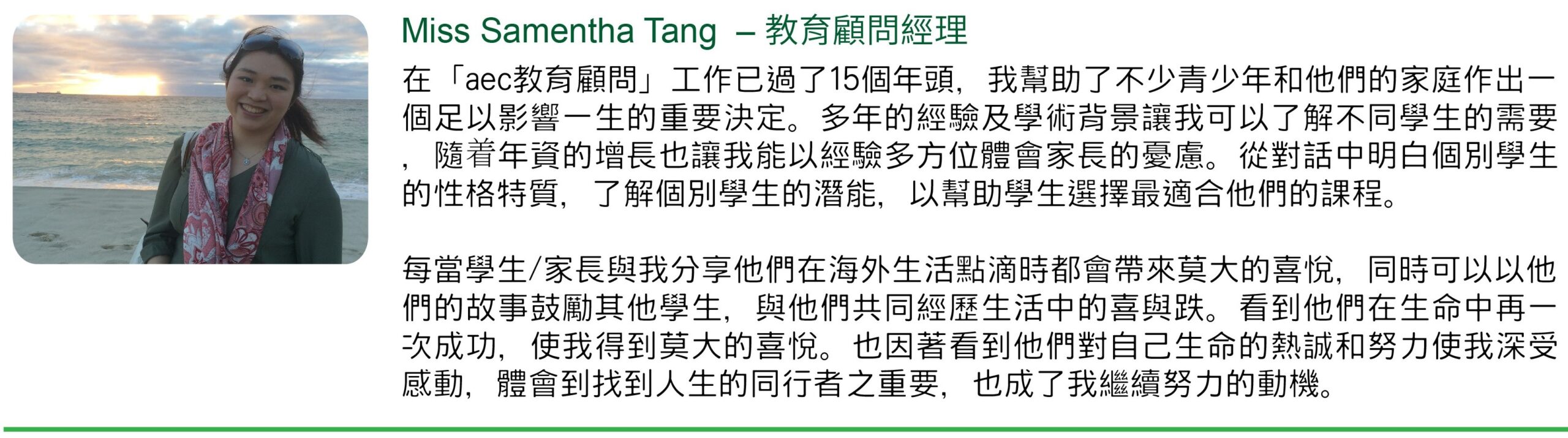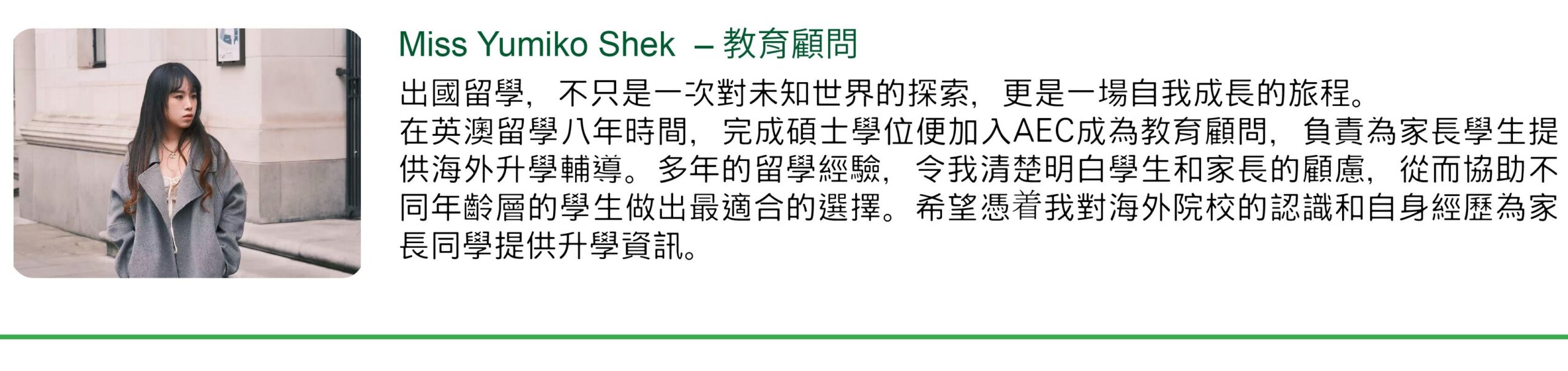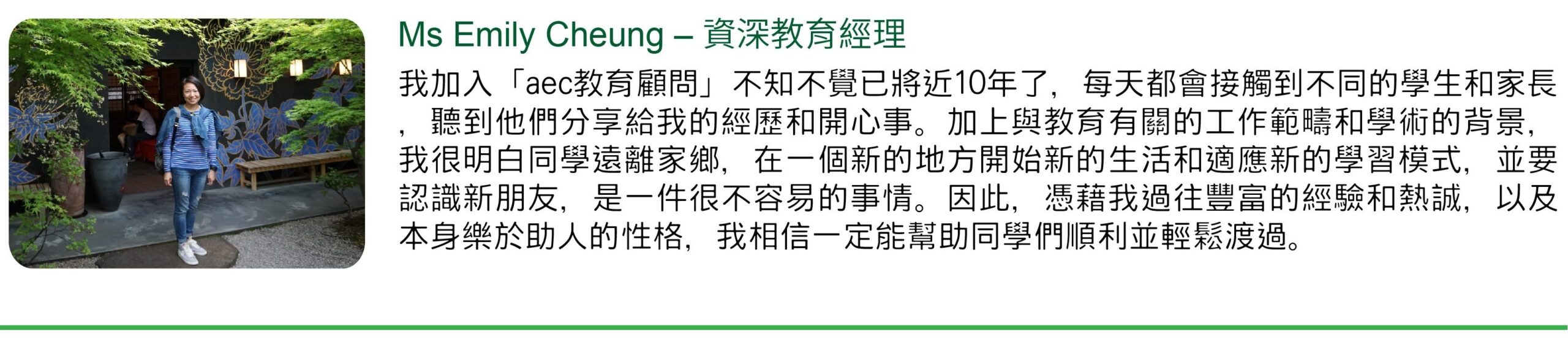 aec 的所有員工均已成功考取 Qualified Education Agent Counsellors (QEAC) 的專業教育顧問資格,本著關懷學生的精神,分享親身的留學體驗。並按照每名個別同學的需要和能力,給予專業而合適的升學計劃及意見。故此在 aec 的協助下,令原本繁複的升學申請過程變得輕鬆容易。