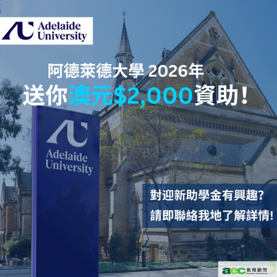 想知多點關於阿德萊德大學的資訊?可以點這裏阿德萊德大學,也可以和我們aec的教育顧問取得聯絡,我們為學生和家長提供一站式的升學資訊及顧問服務。