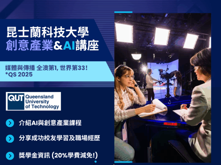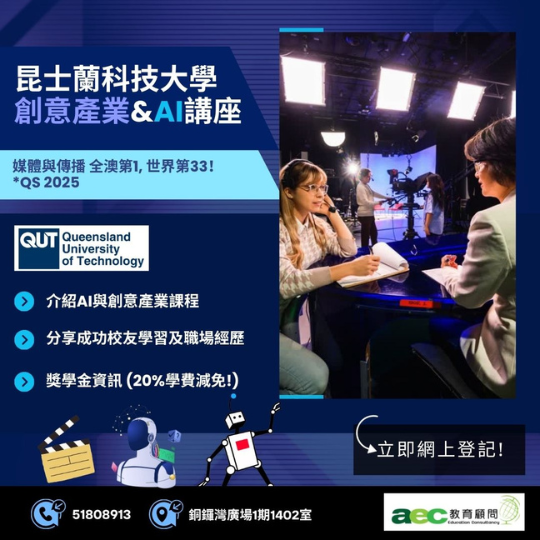 想探索或加入創意產業,乘AI潮流打造職業未來?🔥 昆士蘭科技大學 (QUT) 代表Elsie將親臨aec,舉辦創意產業和AI學科講座!🎨✨ 即場分享QUT創意產業校友成功案例及職場經驗!🎤 仲有 QUT International Talent Scholarship 20%學費減免等你申請! 🎓 QUT昆士蘭科技大學:QS 2025全球排名Top 200 | 🏫 位於布里斯本,QUT以創意產業課程聞名,媒體與傳播排名全澳第1,世界第33!(QS 2025)📺 📚 熱門課程一覽: 創意產業: Screen Content Production:專注電影、電視及數碼媒體製作,培養故事敘述及內容創作技能,適合廣告、影視製作人!🎬 Interactive and Visual Design:涵蓋平面設計、網頁設計及UI/UX,結合創意與科技,開創數碼設計未來!💻🎨 Games and Interactive Environments:專注遊戲設計及互動媒體,運用AI打造沉浸式體驗,成就遊戲開發夢想!🎮🕹️ Animation:聚焦動畫製作與數碼故事敘述,結合AI技術,打造引人入勝的視覺內容!🖼️ Fashion Communication:專注時尚營銷與媒體傳播,培養品牌推廣與市場策略技能,開啟全球時尚產業之路!👗 Journalism:培養新聞報導與多媒體故事敘述技能,適合傳媒與內容創作職業!📰 Media and Communication:聚焦策略傳播與數碼媒體,助你成為傳播專家與創意領袖!📱 AI與科技: Master of Digital Communication:深入數碼媒體策略及AI應用,適合進階傳播與內容創作職業!📱 Master of Design (Strategic Design):探索創新設計解決方案,結合AI與策略思維,打造未來設計領袖!📐 Master of Artificial...Read More