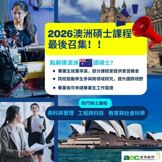 📢 2026年2月澳洲碩士課程報讀機會仍未結束! 🇦🇺✨別錯過到澳洲留學的機會!🚀 夢想進修碩士,提升事業前景?💼 想轉換專業跑道?🔄 還是目標攻讀博士學位?🎓 無論你的目標是增強專業技能、提升就業競爭力、追求更高薪酬,抑或開啟學術研究之路,我們都能助你一臂之力!🌟 🌏 為什麼選擇澳洲進修碩士? • 世界級教育:澳洲擁有全球頂尖大學,如悉尼大學、新南威爾斯大學、,學術資源豐富,學位國際認可!🏫 • 多元文化環境:體驗包容的國際化氛圍,結交來自全球的同學,拓展人脈,提升國際視野!🌍 • 就業優勢:澳洲碩士課程注重實踐,畢業生就業率高,部分課程更提供實習機會!💼 • 優質生活:安全宜居的環境、宜人的氣候,讓你在學習之餘享受高品質生活!🌴 • 移民機會:完成學業後可申請畢業生工作簽證,為未來就業或移民澳洲鋪路!🛂 🔥 澳洲熱門碩士課程推薦: 📈 商科與管理: 澳洲的商科及工商管理碩士(MBA)課程享譽全球。新南威爾斯大學(UNSW)的商學院在QS世界排名前30,蒙納殊大學及悉尼大學的商業分析與金融課程亦表現卓越 🌟 💻 數據科學與IT: 澳洲國立大學(ANU)及新南威爾斯大學(UNSW)的網絡安全課程全球領先,涵蓋網絡防禦、加密技術及數據管理,學制約3年,與業界合作提供實習。畢業生可從事資訊保安顧問、系統審計員或網絡犯罪調查員等高薪職業 ⚙️ 🔧 工程與科技: 昆士蘭大學(UQ)、阿德萊德大學 (AU)及西澳大學 (UWA) 的工程碩士課程聞名全球,涵蓋環境工程、機械工程及可再生能源,學制2-3年,結合實務項目與業界合作。畢業生可成為可持續發展工程師、項目經理或技術顧問 🌍 📚 教育與社會科學: 悉尼大學及莫納殊大學的教育與社會科學碩士課程備受推崇,涵蓋教育領導、心理學及社會工作,學制約2年,提供實習與研究機會。畢業生可成為教育顧問、心理輔導員或社會政策分析師,改變社區未來 🤝 分數不夠?別擔心!仲可以申請預科碩士(Pre-Master),輕鬆過渡到正式課程📈!預科碩士課程專為學術背景或分數未達正式碩士入學要求的學生設計,課程為期6-12個月,幫助學生提升學術英語、專業知識及研究技能,為進入頂尖碩士課程做好準備。澳洲多間大學,如悉尼科技大學(UTS)、蒙納殊大學等提供靈活的預科課程,助您順利銜接夢想學位! 💡 有其他心儀的碩士課程? 想了解更多澳洲留學資訊?請立即聯繫aec專業顧問為你解答所有疑問!📞