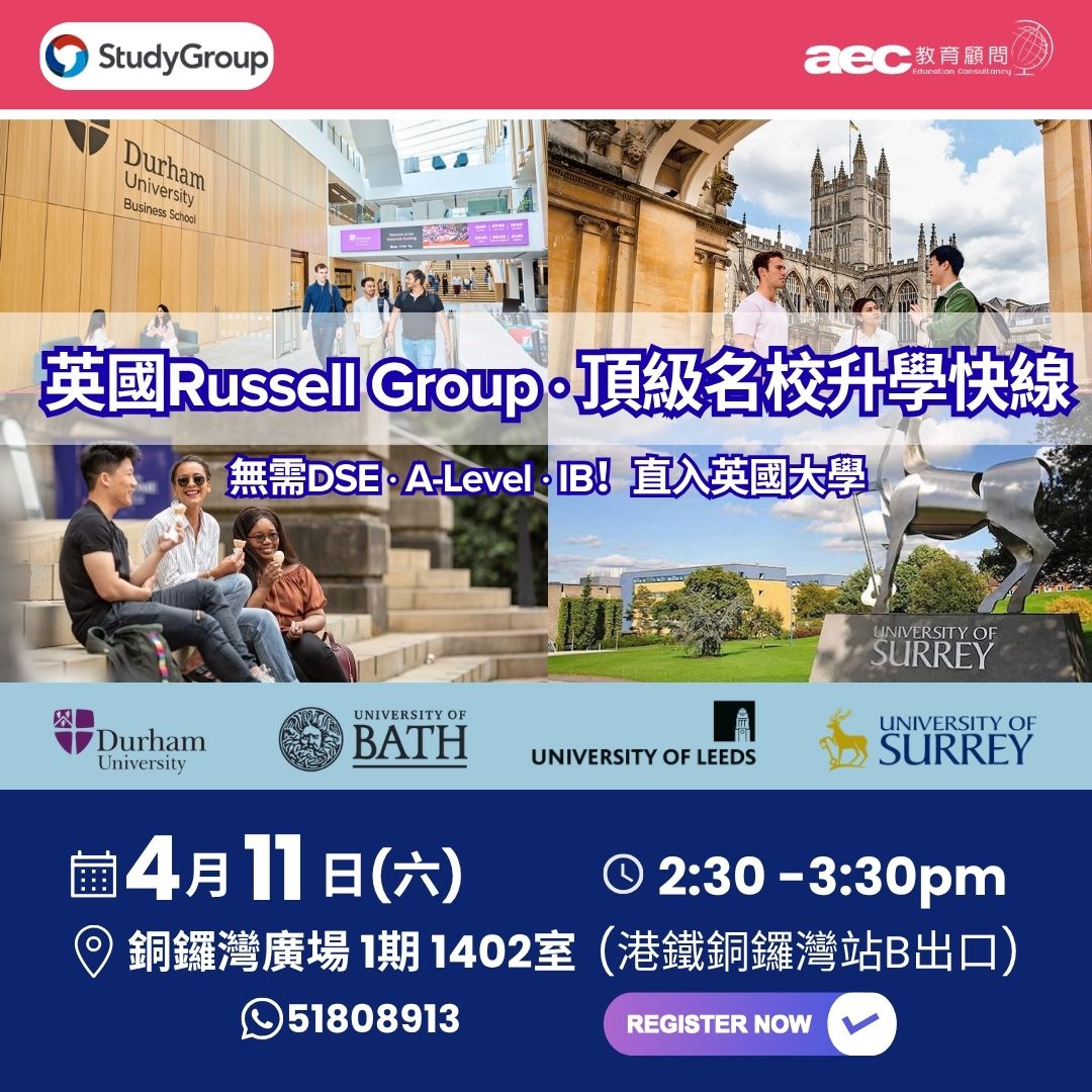 完成 GCSE 或 Form 5 的你,正在尋找入讀英國頂尖大學途徑與銜接方案?無需參加 A-Level、HKDSE或IBDP考試,無縫銜接課程直接進入大學階段的學習,你一定要認識! Study Group為你拆解英國頂尖名校銜接課程升學秘笈,包括University of Bath、Durham University、University of Surrey、University of Leeds這幾所優秀大學。 Durham University(杜倫大學) ✨ 領先的學院制大學,以世界級的研究與教學聲譽聞名 熱門學科: 法律、商科、工程學 全英排名*:3 University of Bath(巴斯大學) ✨ 卓越的教學與研究聲譽 熱門學科:工程與建築學科、藥劑學、運動科學、心理學 全英排名*:7 University of Leeds(里茲大學) ✨以卓越的研究影響力與出色的學生體驗著稱,屬於羅素集團大學 熱門學科: 商科、傳理系、工程學、生物科學 全英排名*:26 University of Surrey(薩里大學) ✨ 以實務導向與獸醫學、太空工程聞名,强調創新與就業準備,提供良好實習與就業機會 熱門學科:獸醫、工程學、商科、旅遊管理 全英排名*:31 *The Times University Ranking 2026 講座內容重點: 大學基礎班、國際大一、碩士銜接等課程介紹 四所大學之課程特色、入學要求與申請流程 課程選擇與職涯規劃 住宿、生活與學生支援服務簡介 現場答疑:為學生與家長解答個別升學疑問   日期︰4月11日(星期六)...
