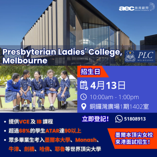 4月13日-【Presbyterian Ladies’ College, Melbourne 來港面試招生日週】