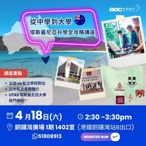 今個星期六,aec將舉辦專題講座,深度解析塔斯曼尼亞從中學至大學的一條龍教育體系,協助家長與學生全面了解當地的學術優勢與生活配套。